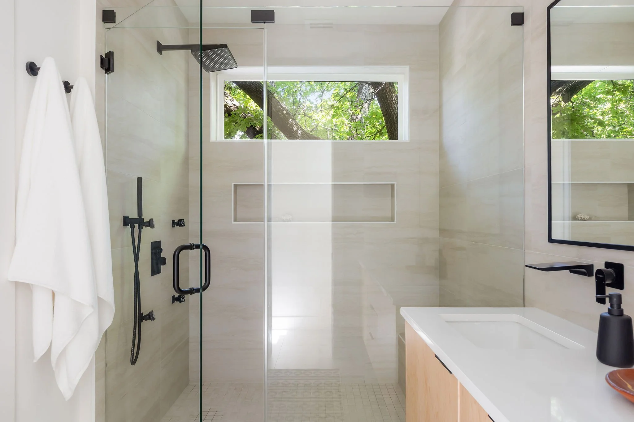 Upstairs, both the primary and secondary bedrooms open to a custom screened deck, perfect for relaxing among the treetops. The primary suite includes a dual vanity, frameless walk-in shower, and expansive walk-in closet. The secondary bedroom features its own full bath and large closet.
